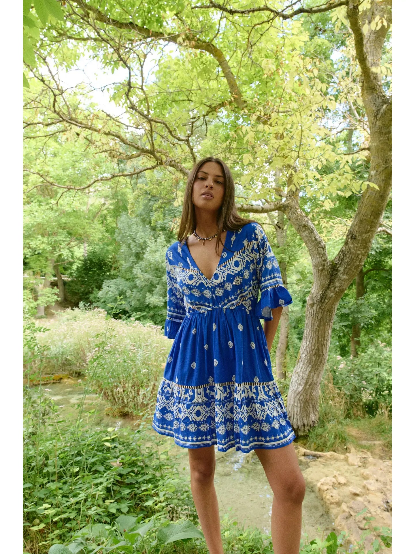The “Greece Blue” short dress stands out for its vibrant blue tone and modern design. Ideal for daytime events or informal outings.