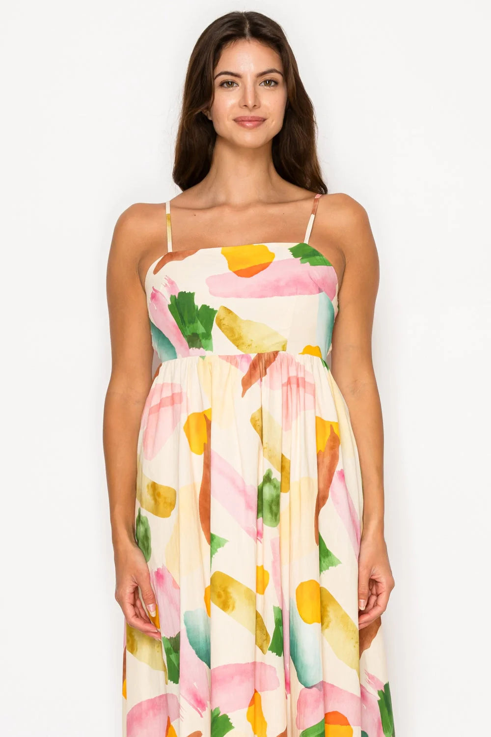 Feel the spirit of an endless summer in this breathtaking abstract floral maxi dress. The striking palette of sunset pink, citrus orange, and lush green mirrors the vibrant flora of the Greek isles, while the elegant straight neckline and delicate adjustable straps create a clean, modern silhouette. Crafted with a flattering fit-and-flare design and a comfortable smocked back for a bespoke fit, this dress moves beautifully as you wander through winding village paths or enjoy a seaside lunch. It's the ultimate, easy-to-wear piece that promises pure, captivating romance.