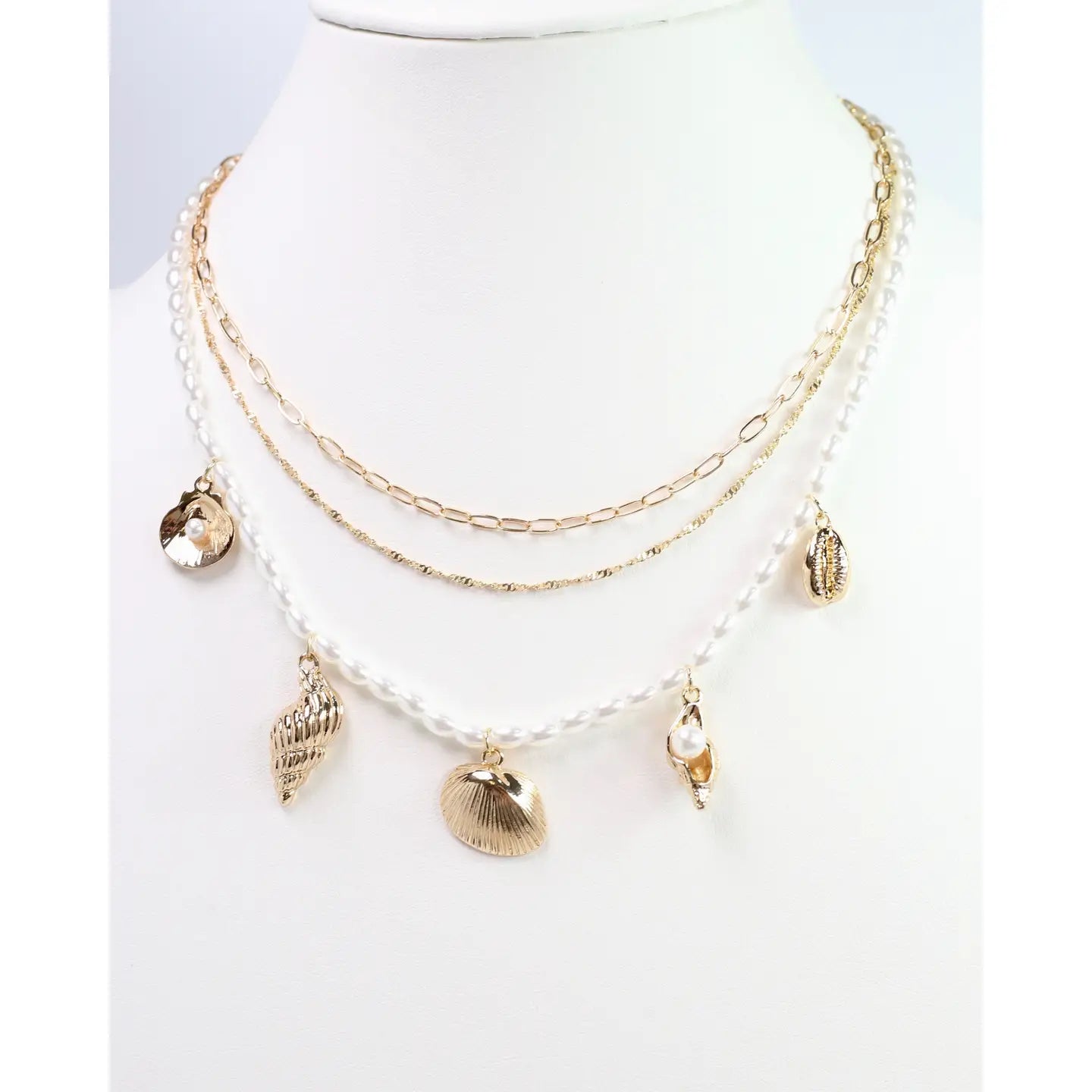 Splash into style with this triple-layered gold necklace! Featuring seed pearls, adorable sealife charms, and shell accents, it's the perfect way to catch the ocean-inspired trend without getting wet!