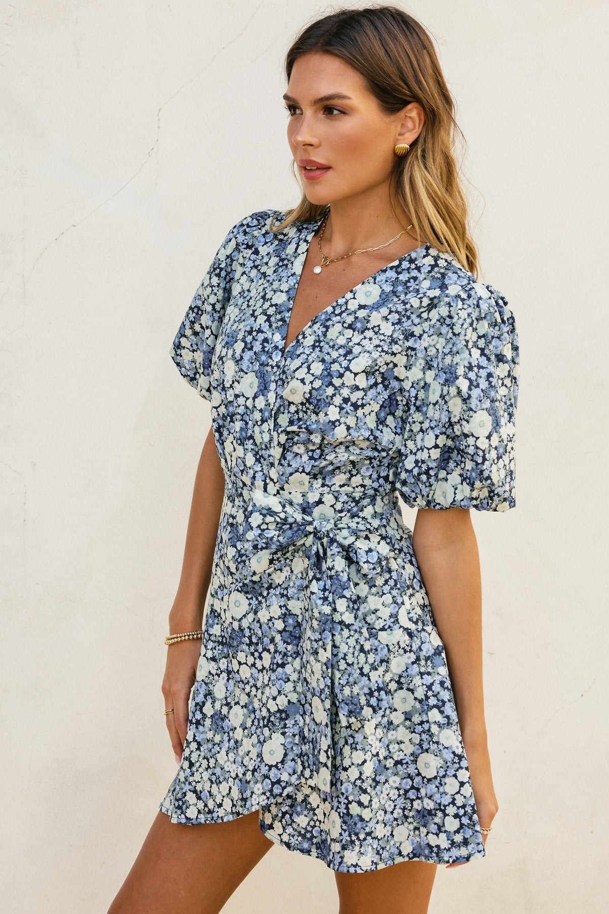 Twirl into dinner with effortless charm in this Field Daisies wrap dress. The puff sleeves add a flirty touch while the mini length keeps things modern and fun. Crafted for those who love a dress that transitions seamlessly from casual to cocktail hour, this piece wraps you in comfort and style. Perfect for date nights, girls' dinners, or whenever you want to feel absolutely fabulous.