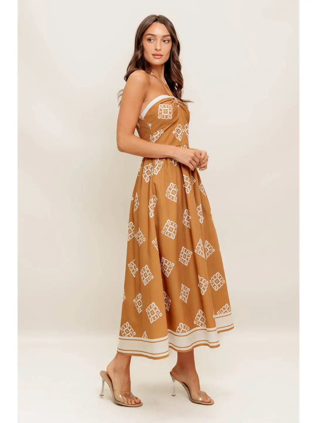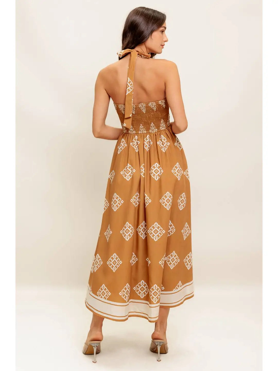 A printed woven midi dress featuring halter neckline with back neck tie, full skirt and smocked back bodice