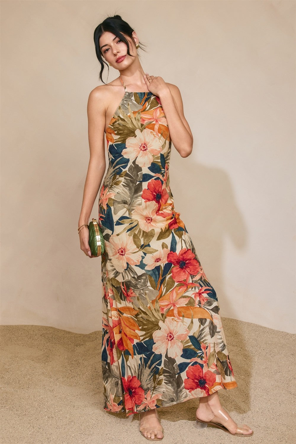 Tropical floral print rayon linen blend maxi dress featuring an open back with tie closures. Model is 5'8" and wearing size Small.