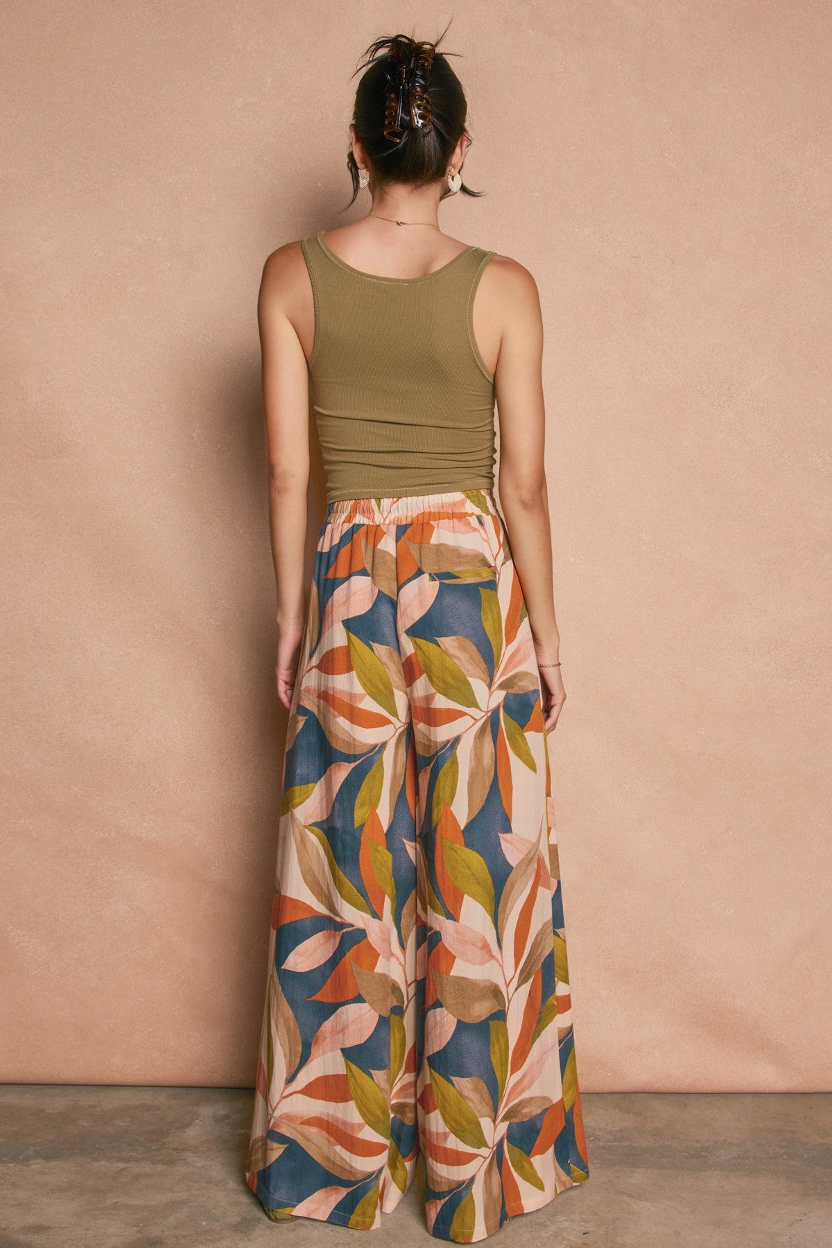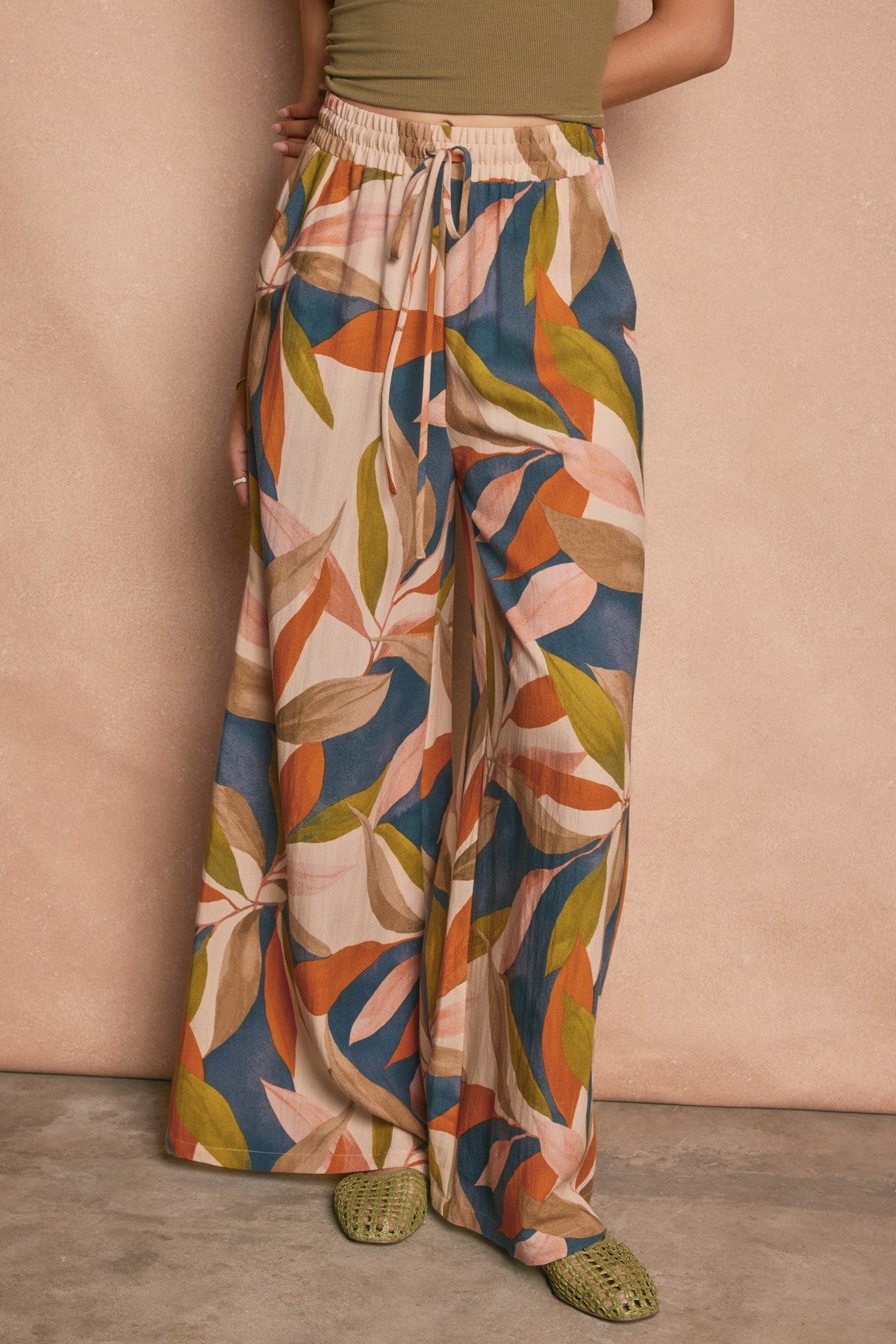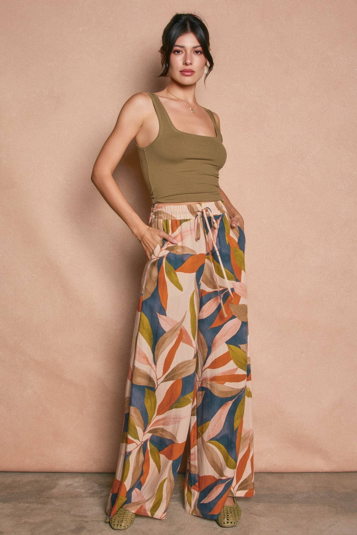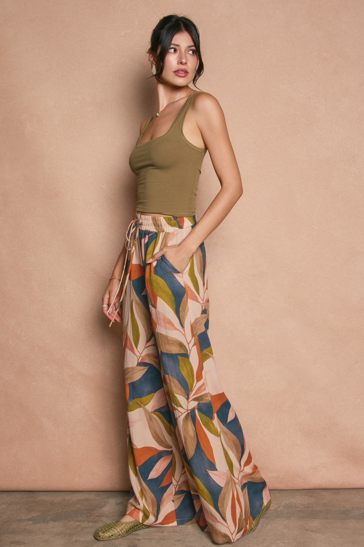 Tropical print rayon nylon pull on pants with side pockets. Model is 5'8" and wearing size Small.