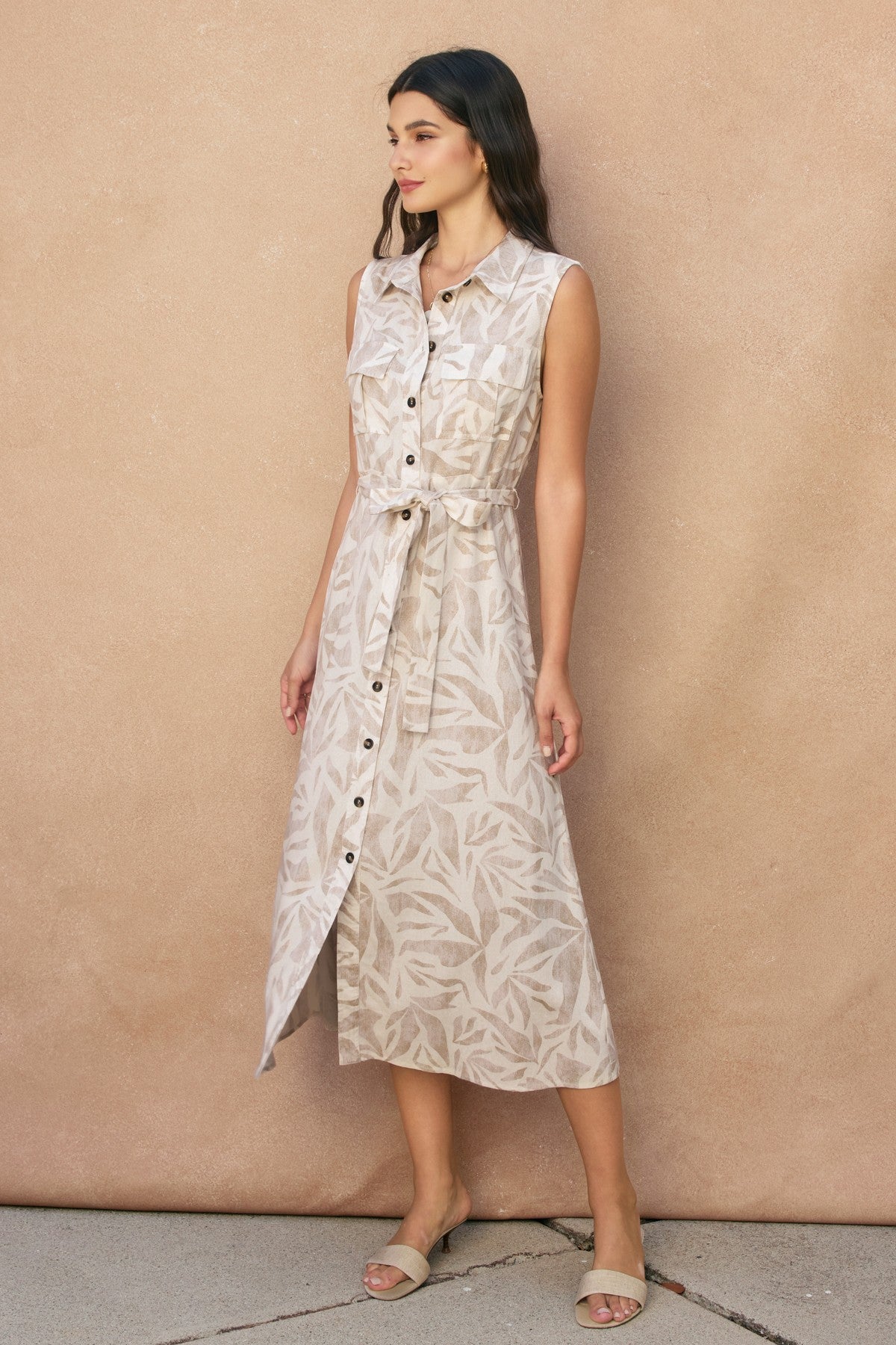 Tropical leaf print breezy rayon linen sleeveless shirt dress. Model is 5'9" and wearig size Small.