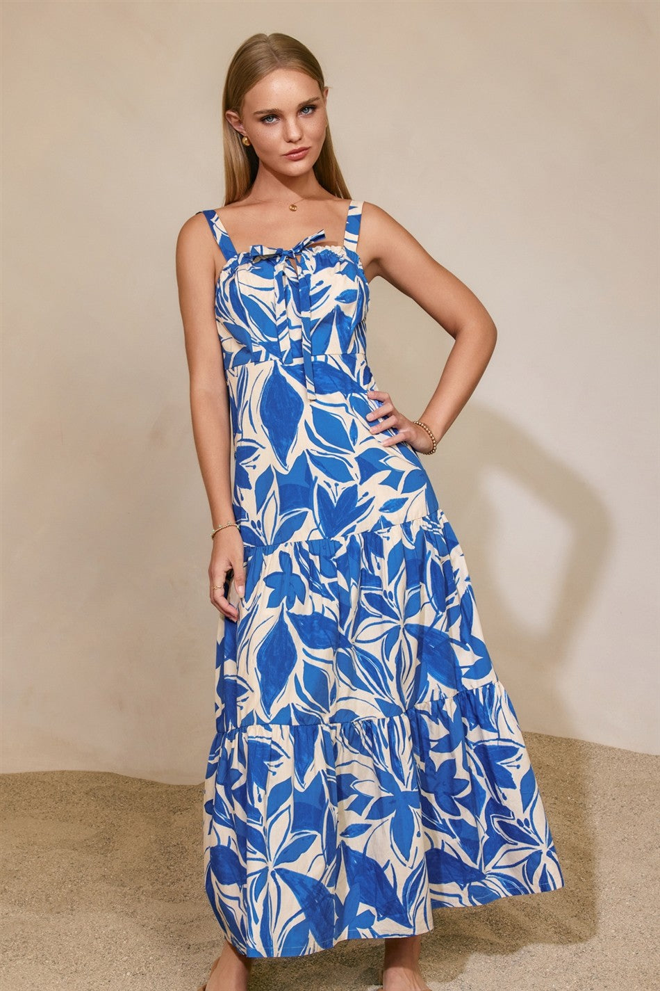 Two tone floral print cotton poplin maxi dress. Model is 5'9" and wearing size Small.