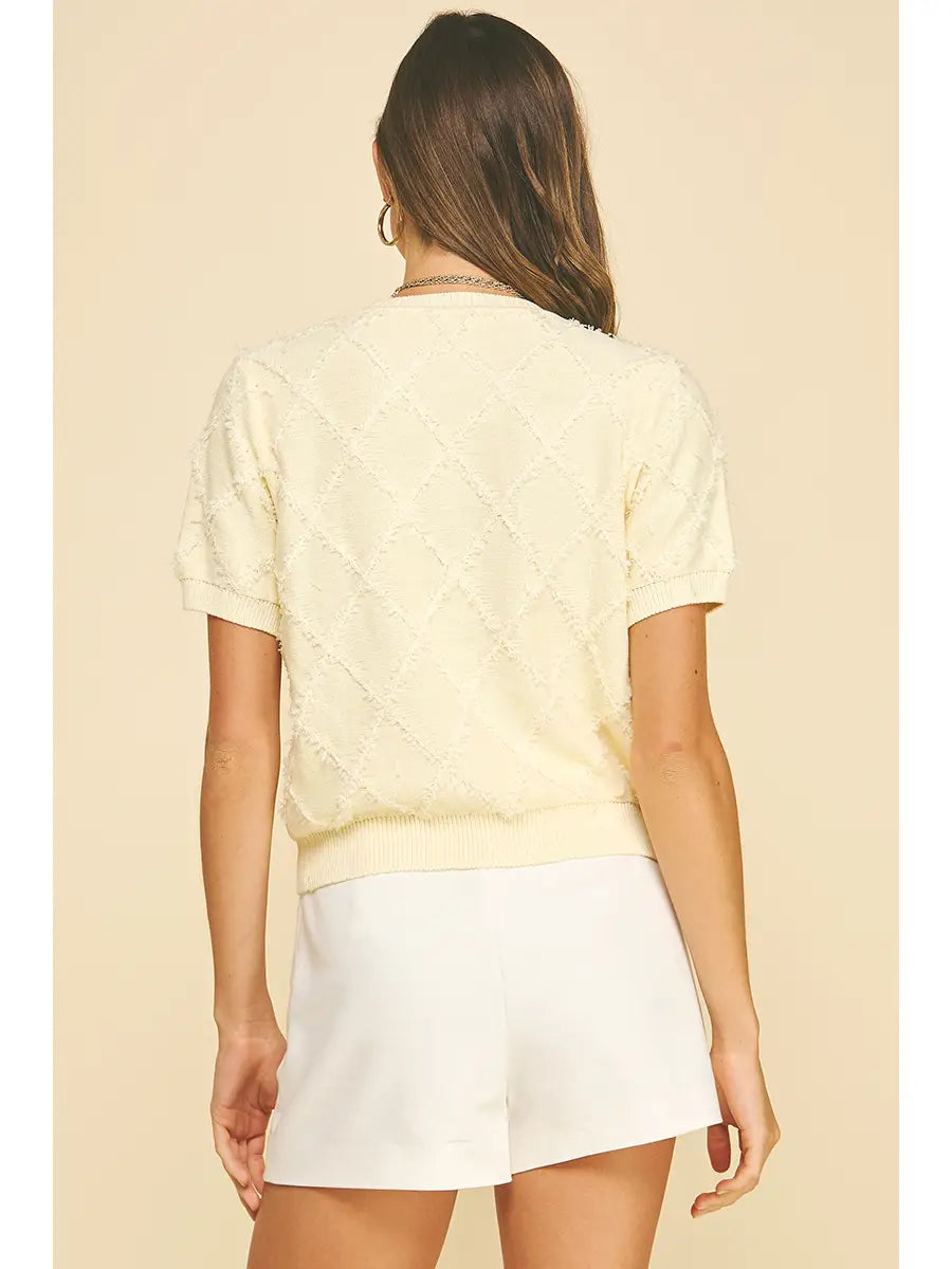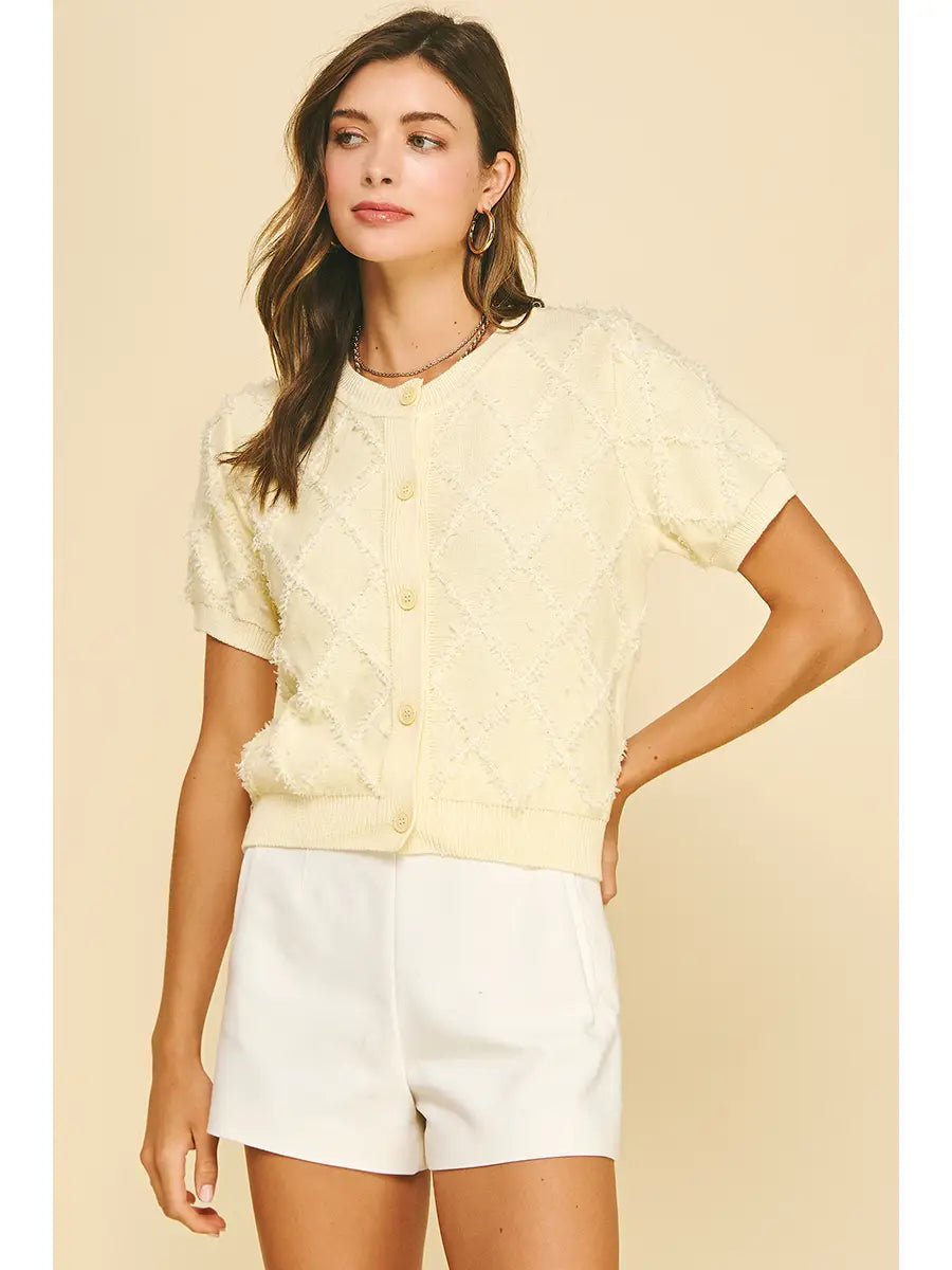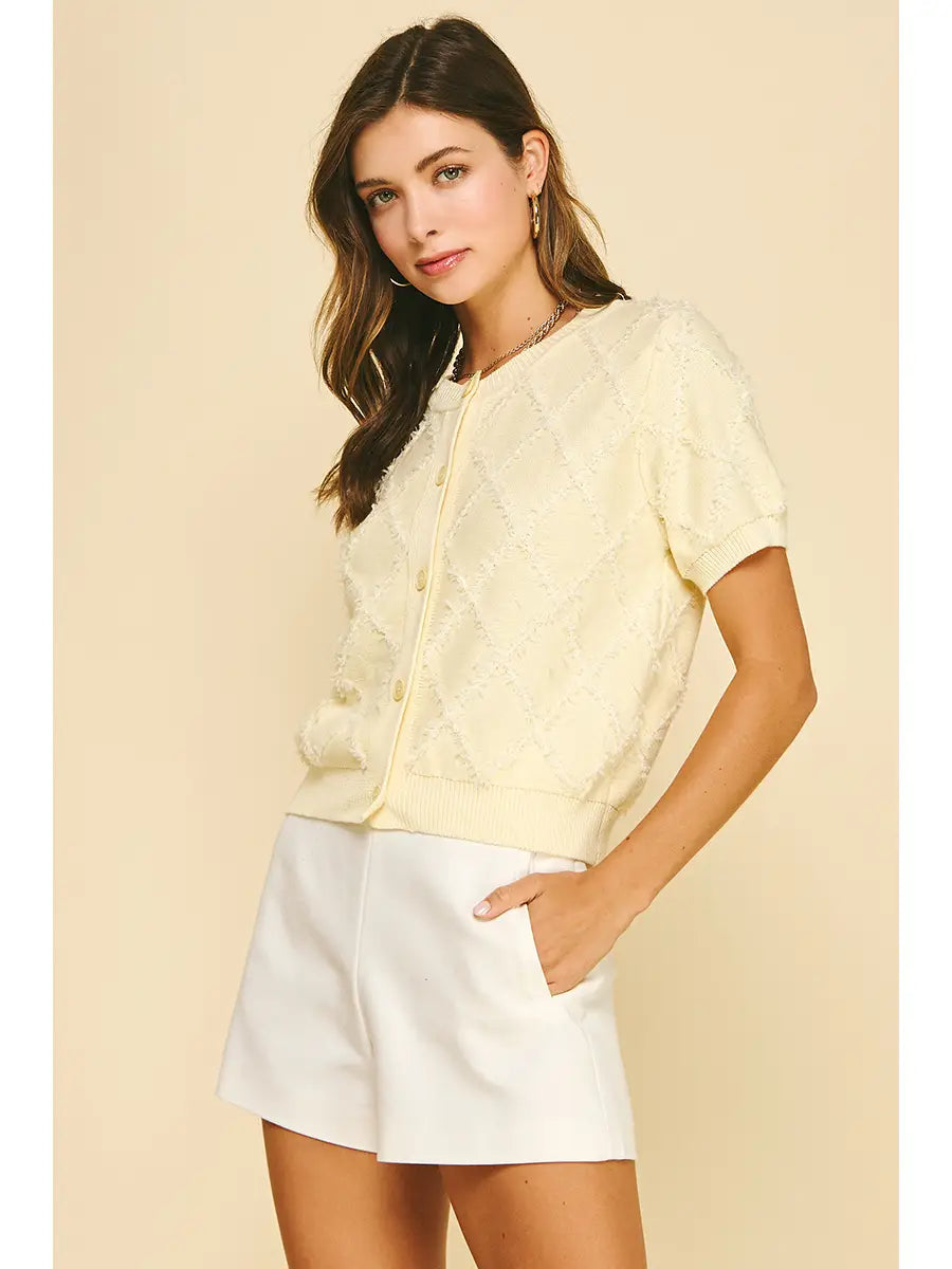 Elevate your spring wardrobe with this textured diamond pattern knit cardigan. Crafted with a classic yet contemporary design, this versatile layer transitions seamlessly from casual days to polished evenings. The intricate diamond texture adds visual interest and dimension, while the soft knit fabric provides comfort and breathability for warming weather. Perfect for layering over dresses, tees, or worn open as a statement piece. A timeless essential that works with everything in your closet.