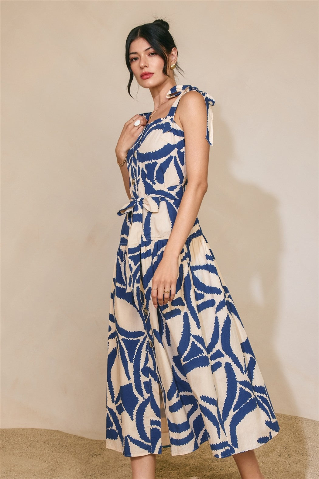 Printed midi dress with button placket and self tie wide shoulder straps. Model is 5'8" and wearing size Small.