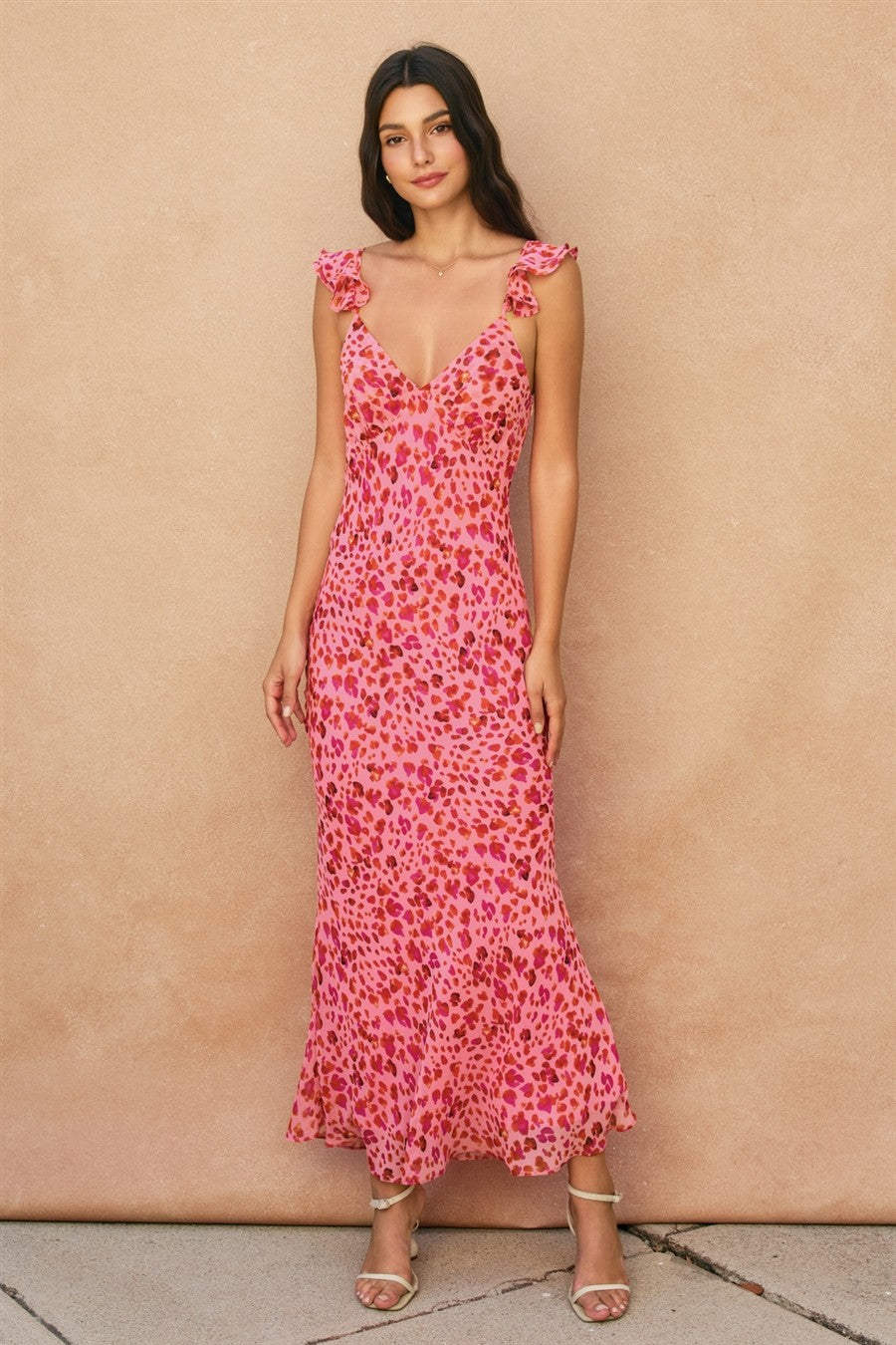 Animal print satin jacquard maxi dress with flutter sleeves. Model is 5'9" and wearing size Small.