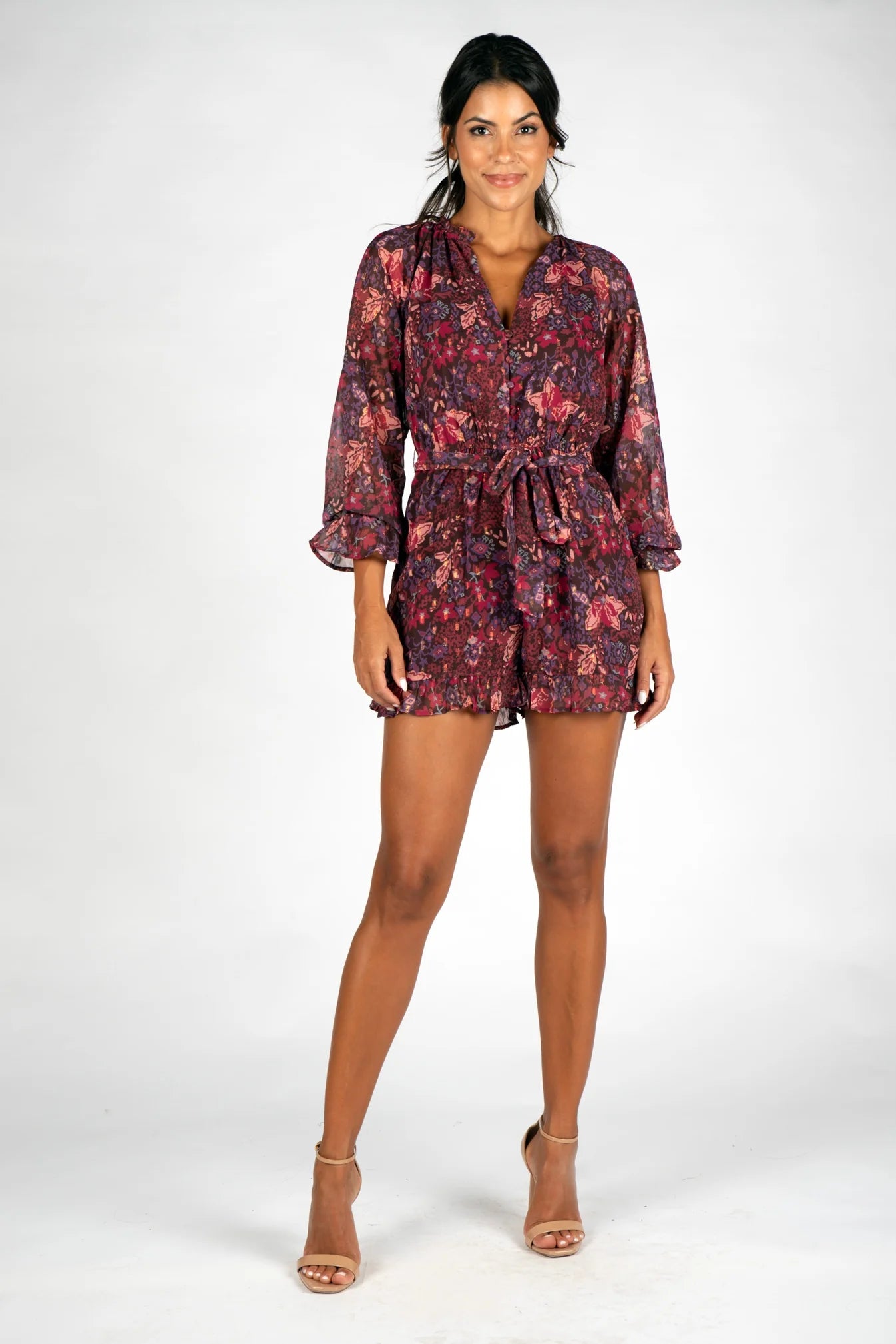 Elevate your wardrobe with the Ember Romper in Midnight Floral, a versatile piece that combines the beauty of florals with the ease of a romper. This delightful ensemble is designed to make you shine, whether you're out for a sunny day adventure or attending a stylish garden gathering.