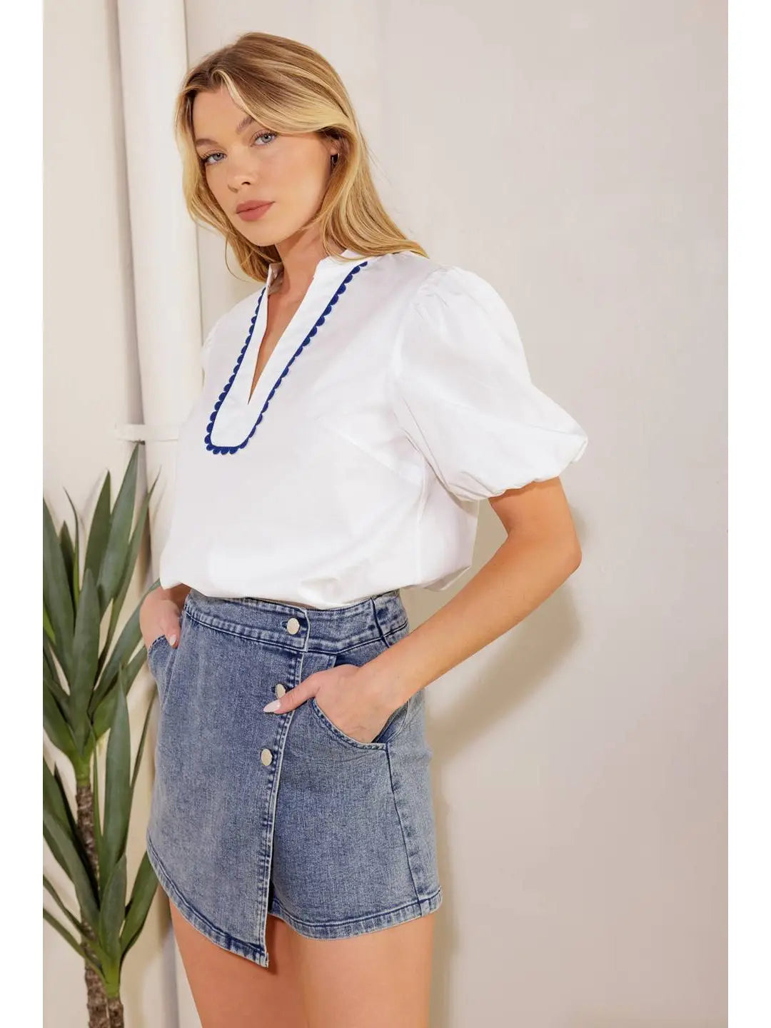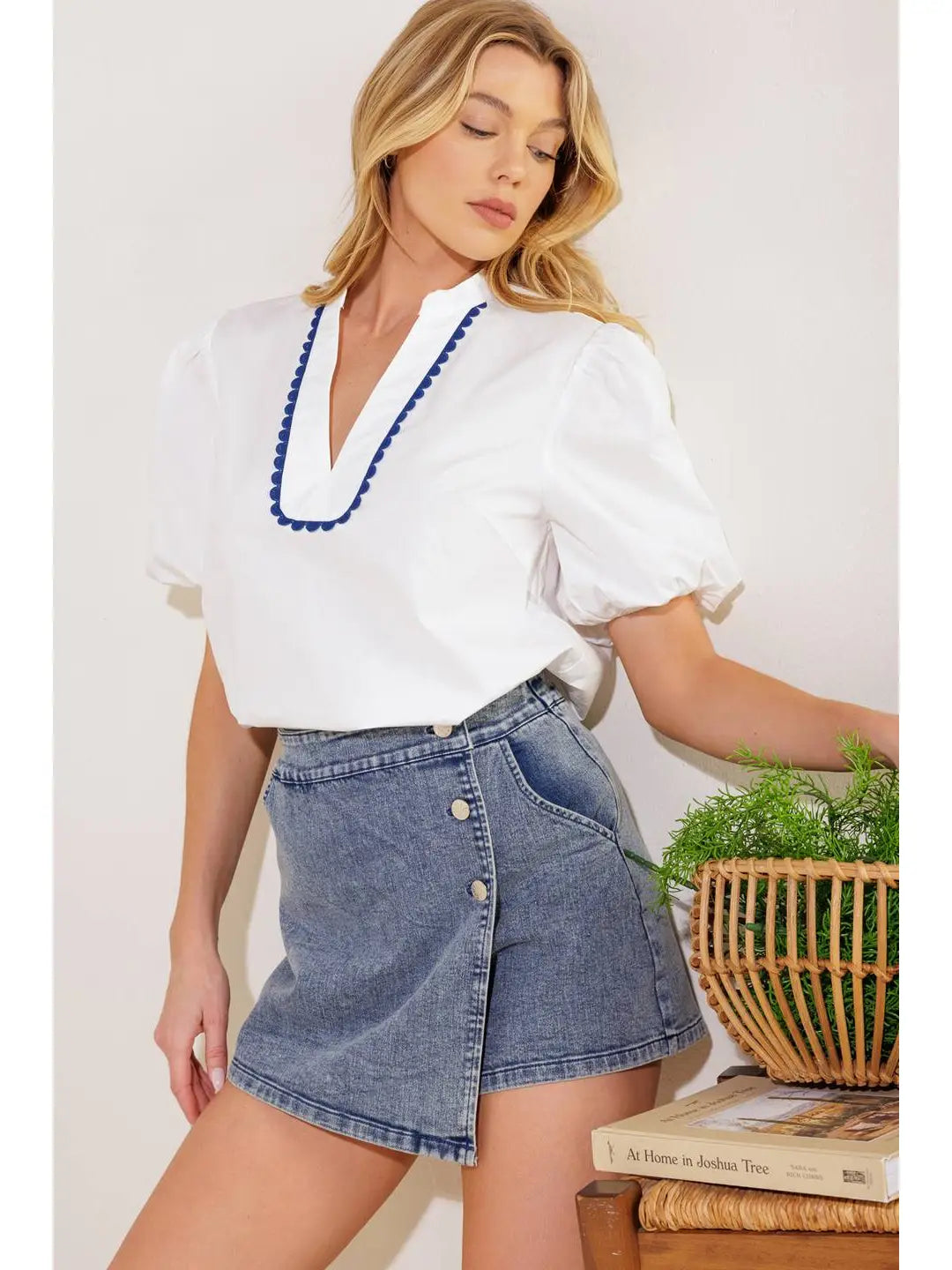 An acid washed denim skort featuring front button detail, side pockets and back zipper closure