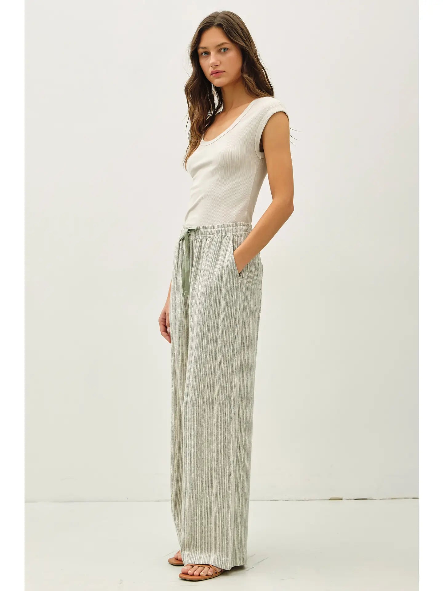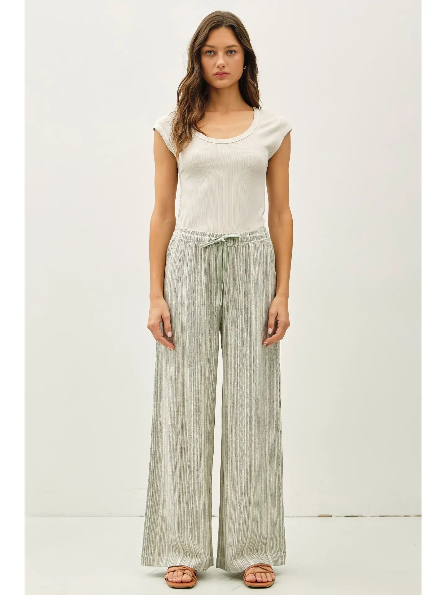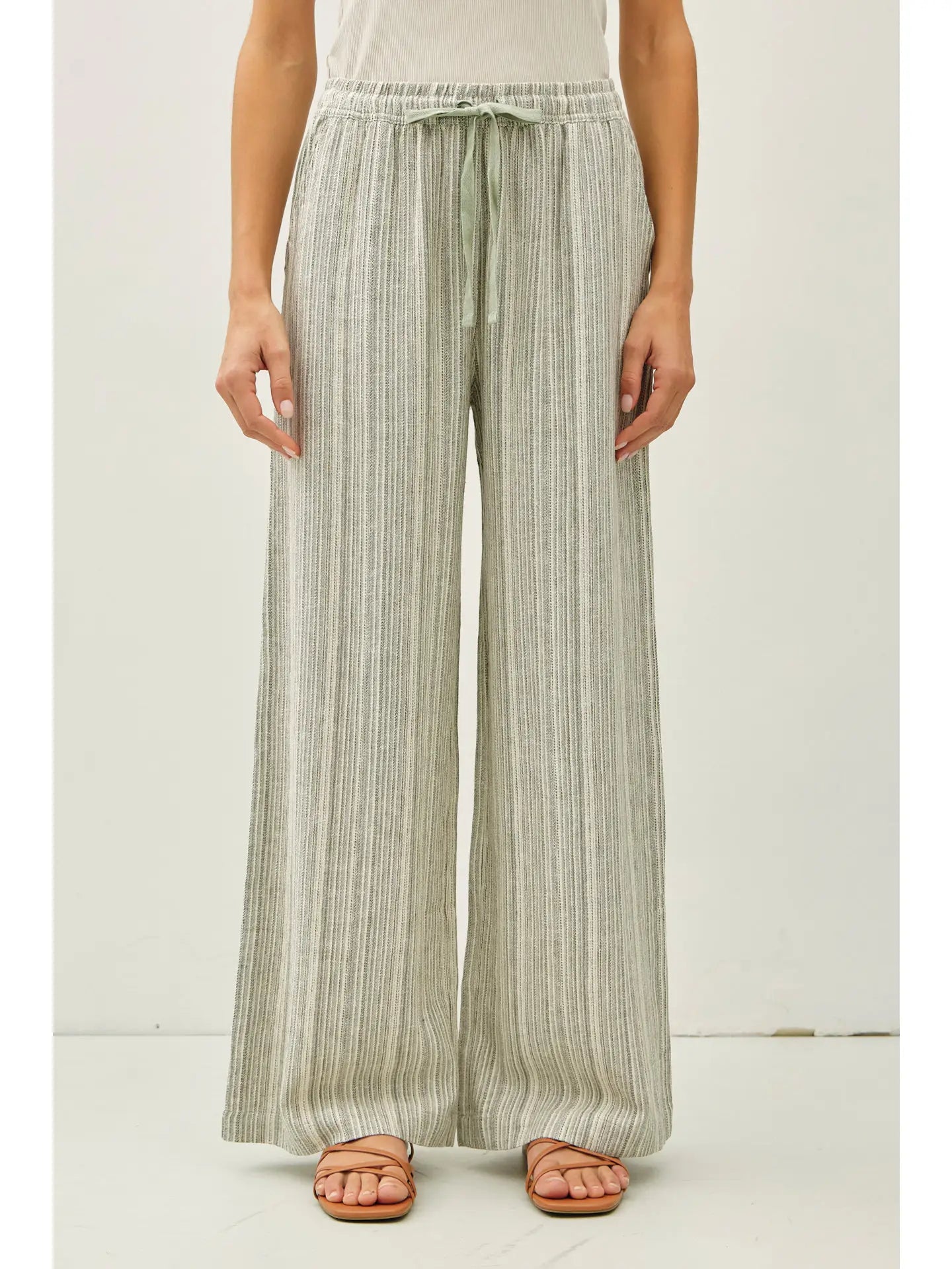 Pull on pants - Wide leg - Stripe - Relaxed fit - Drawstring waist - Elastic waistband - Comfy - Linen blend - Pants - Full length - Inseam 29"