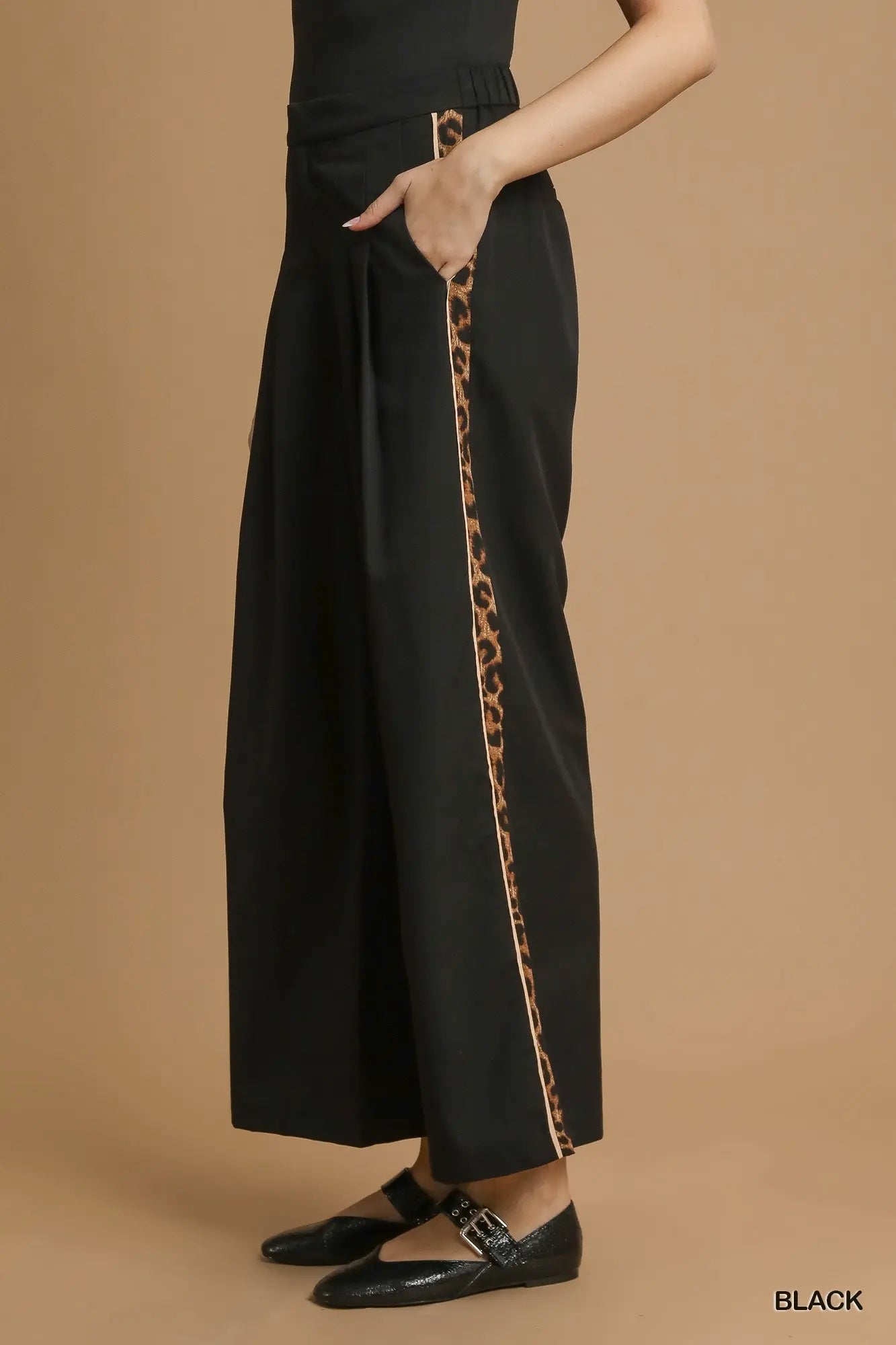 • Wide-leg pants• Leopard print side stripe• Relaxed, flowy wide-leg silhouette• Front zipper with hook fastening• Side pockets• Not Lined