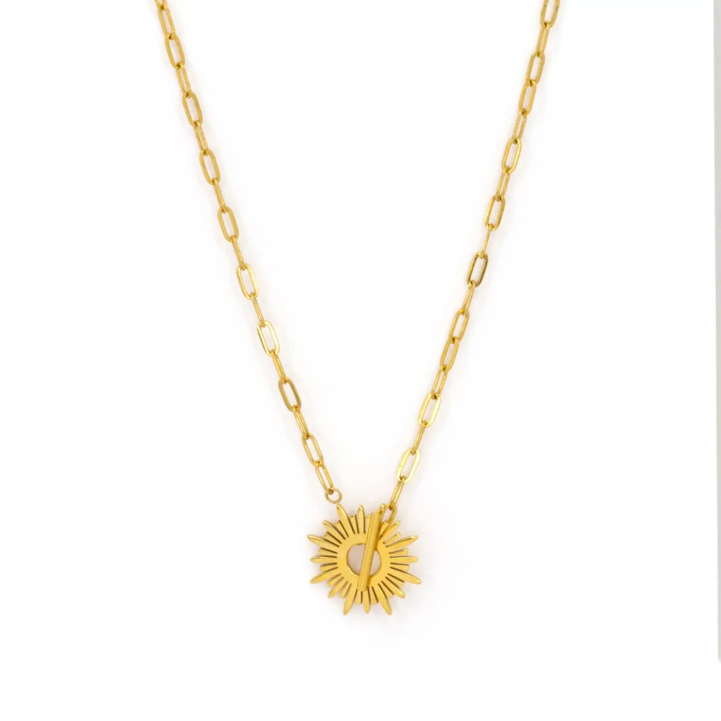 The Sun might just be the most universal symbol in the world. Bringing warmth, positivity, and light to each day as it rises, leaving each day with a beautiful painted sky sunset. The Sol Necklace is the shine of the sunrise with the intricate details of a sunset... the best of both worlds in a design that you won't want to take off. Product Details Water and Sweat Resistant Stainless Steel, 18k Gold Plated