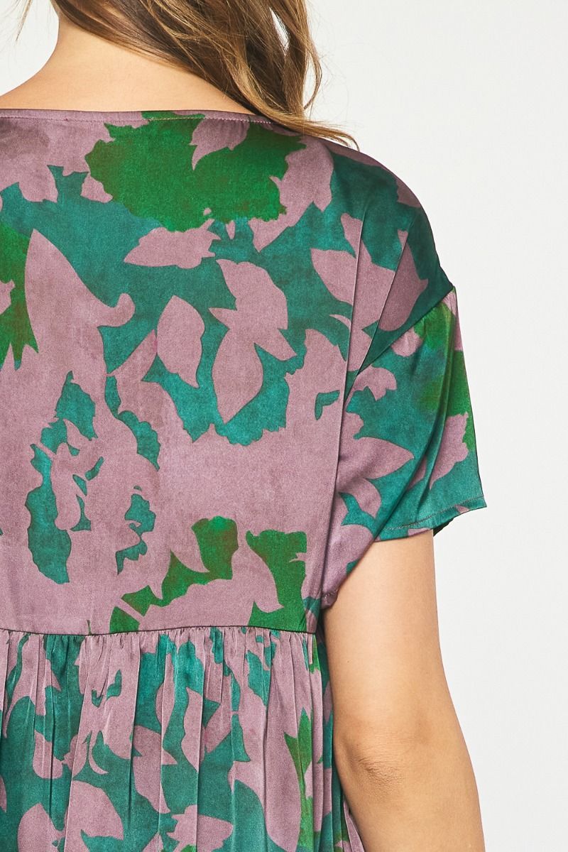 Printed short sleeve mini dress featuring pockets at side. Lined. Woven. Non-sheer. Lightweight.