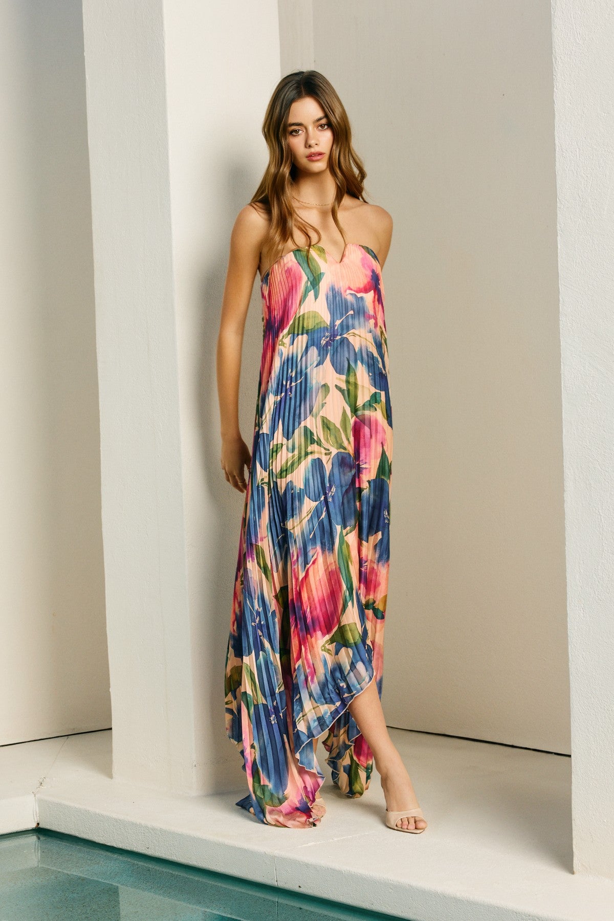 Floral print satin column maxi dress with a V-cut detail. Model is 5'8" and wearing size Small.