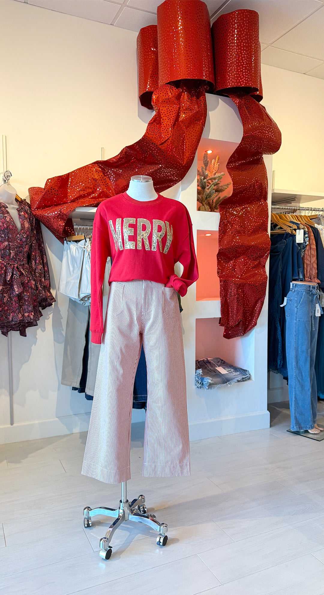 Spread holiday cheer in this festive sequin sweatshirt! Featuring the word "merry" in shimmering sequins, it's the perfect blend of cozy comfort and sparkly fun. Whether you're heading to a holiday party or just want to add some glitter to your everyday look, this playful piece delivers major seasonal vibes. Soft, comfortable, and undeniably eye-catching—because the holidays deserve a little extra shimmer!