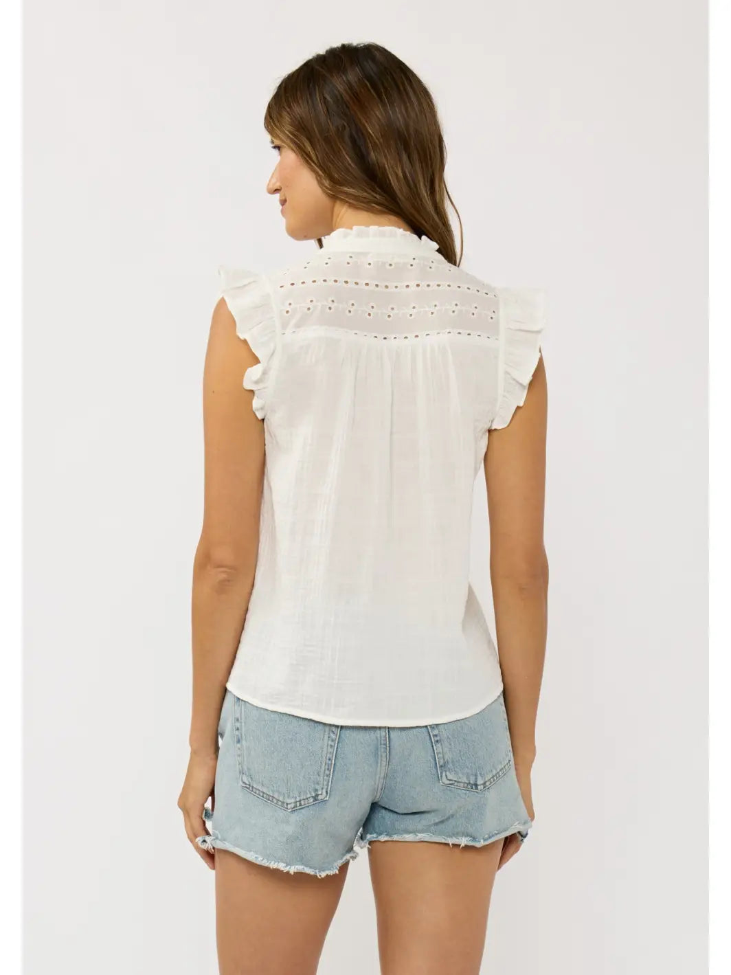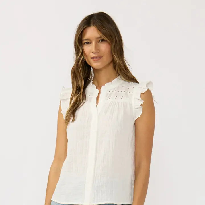 Fresh and lightweight, this woven blouse pairs TMO novelty gauze with embroidered flower yokes, finished with soft ruffle sleeves, shirring, and a clean button up front.